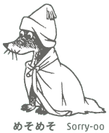 めそめそ その名のとおりめそめそ おどおどした臆病もの ぼろぼろのずきんに安全ピンでとめた毛布をまとっているが 勇ましいオオカミにあこがれている ムーミン屋敷の水浴び小屋に住んでいる Close
